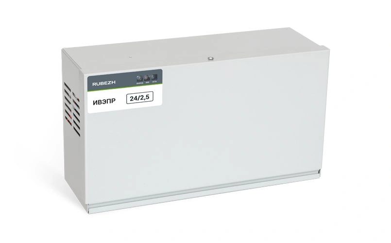 Импульсный источник питания ИВЭПР 24/2,5 предназначен для стабильного бесперебойного электропитания систем охранной и пожарной сигнализации, пожаротушения, дымоудаления и оповещения. Источник питания выполнен в металлическом корпусе с возможностью установки двух 12-вольтовых АКБ, соединяемых последовательно. В схеме ИВЭПР 24/2,5 применён «интеллектуальный электронный ключ», обеспечивающий контроль состояния АКБ и корректировку тока их заряда, что в совокупности с высоким КПД и низким тепловыделением источника обеспечивает полный срок службы АКБ. Отличается высокой надёжностью, расширенным диапазоном сетевого напряжения и пониженным уровнем высокочастотных помех. Источник сертифицирован на соответствие ГОСТ Р 53325-2009.